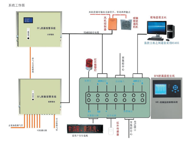 实时浓度显示 支持RTU遥测遥信功能,远程启动风机功能; 风机启动方式:定时启动、报警启动、有人时自动启动、远程启动、手动启动等; 报警参数用户可设置 报警数据海量存储,自动更新。 报警语音功能、报警指示灯或报警显示屏。 SF6检测范围:0~1500ppm,精度不低于50ppm 分辨率:1ppm O2检测范围:0~21.0% 误差:<0.5% 分辨率:0.1% 温度检测范围:-30~+100℃ 精度:0.5℃ 相对湿度检测范围:0~100%RH 精度:1% 工作电源:185~250VAC,防浪涌和雷击功能;自动加强跟踪可疑测量点功能,有效防止误报。